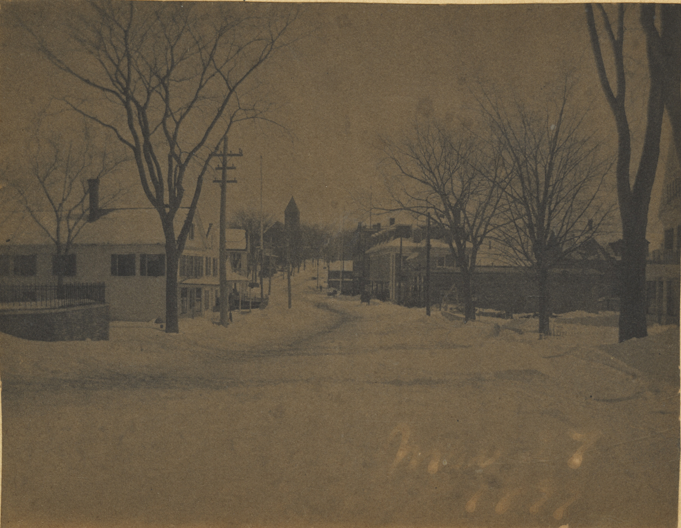 View from North Main St. near the Durgin Block looking toward Brewster Memorial Hall, Nov. 17, 1897. On the left is the Wool Corner building (second building, 2-story columns). On the right is the Goodwin Block, which burned down in 1899. Past that is the Peavey Block, now the Avery Block.