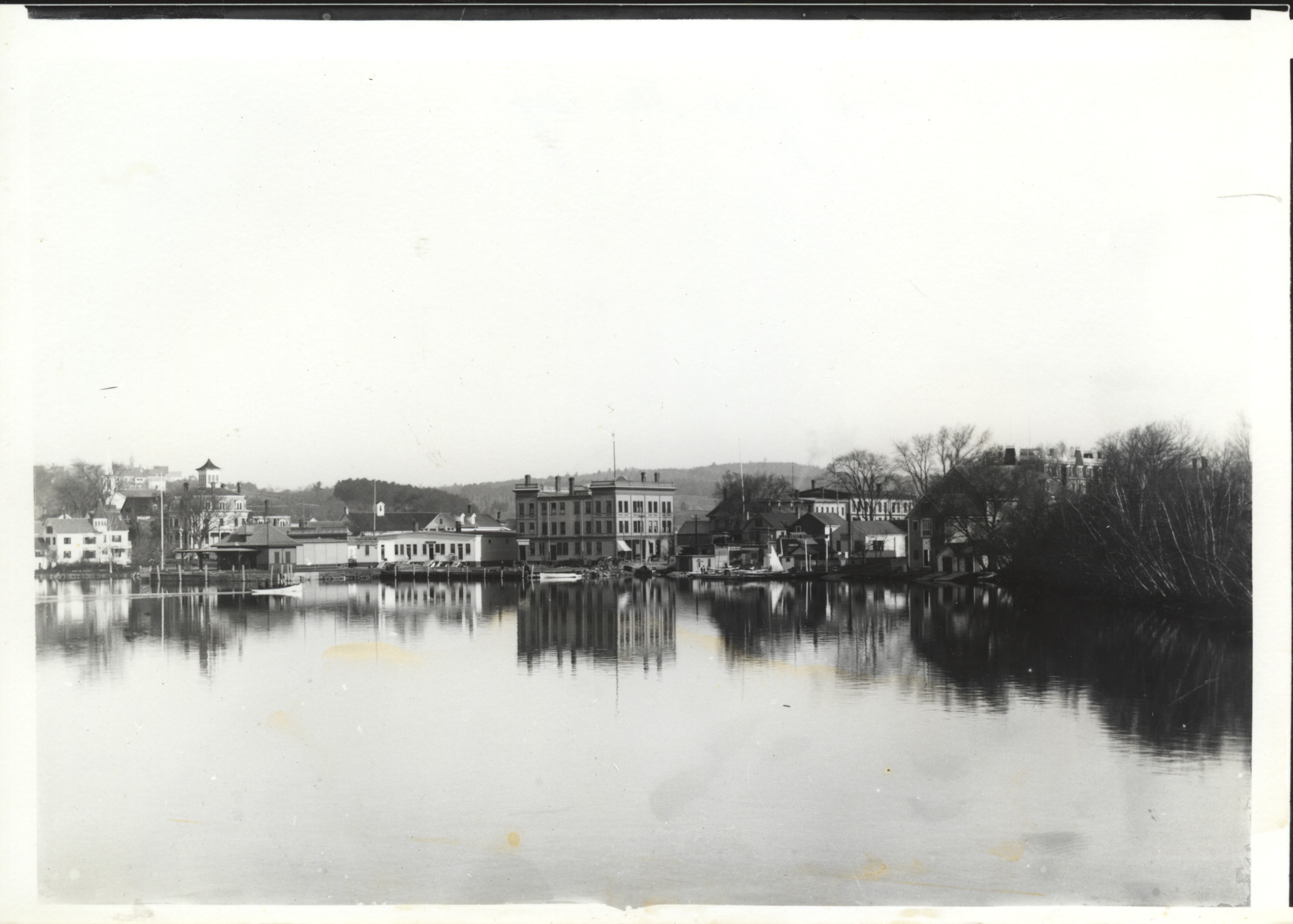 The center of downtown shows, L-R, the Piper House (moved toward the water in 1956 - Yum Yum Bakery is now there), the Durgin Block, the Railroad Depot, the one-story Goodwin Block (after the 1899 fire), the large Peavey Block (now Avery Block), and on the far right above the trees, the mansard roof of Hobbs-Is-Inn, later the Hotel Elmwood, now the Post Office. Notice how close the water is to the buildings; quite a large area was filled in, starting in 1933, to establish the present shore line. C. 1900.