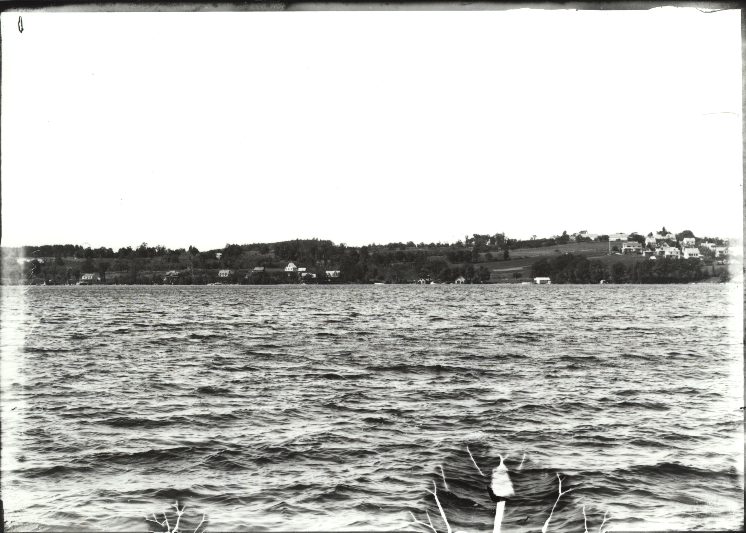 View shows Pleasant Rd. houses on the right, Sewall Rd. shore front and summer homes in the foreground, c. 1900.