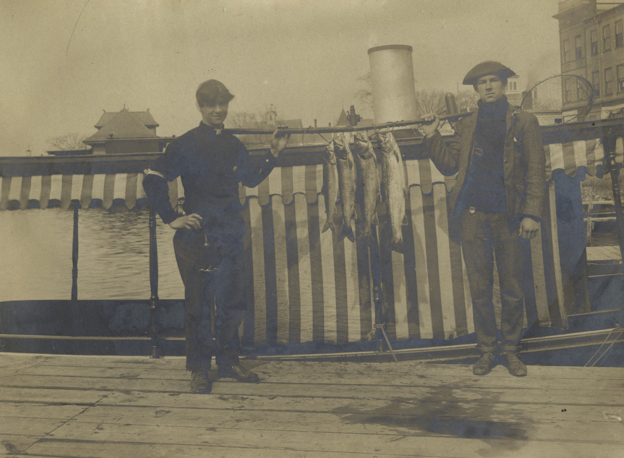 A successful day of fishing, c. 1910. L-R, Everett Kimball and Ned Clark. They are at the town docks. The Peavey Block (now Avery Block) is at the right and the railroad depot is at the left. They are standing in front of Rev. A Edwin Keigwin's boat, Elizabeth. Rev. Keigwin was a summer resident on Sewall Rd.