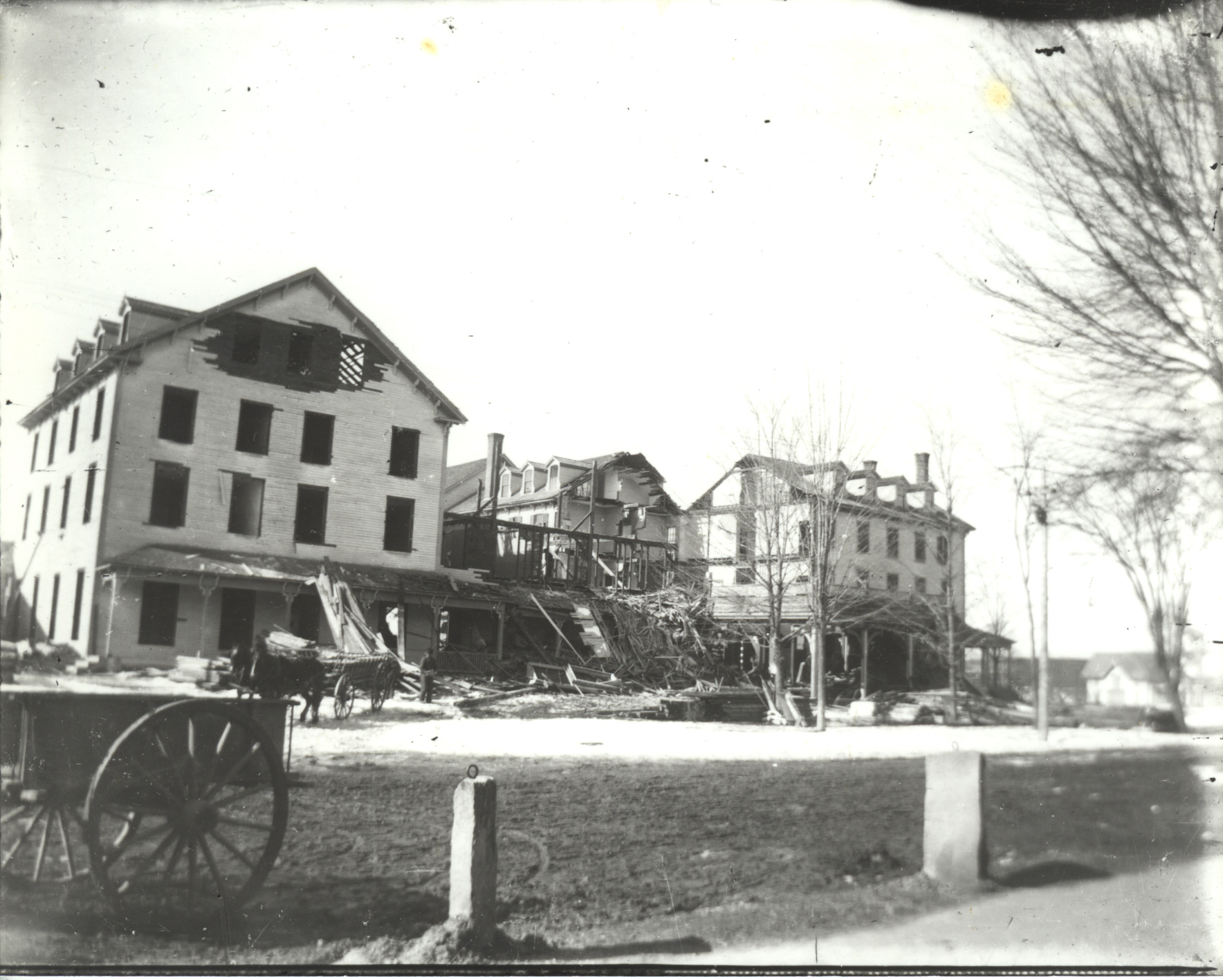 The Pavilion Hotel at Pickering Corner was built in 1849, became the Kingswood Inn in 1890. It was sold at auction on April 3, 1899, for $275. This photo, shortly afterward, shows the demolition in progress. Some parts were salvaged carefully and used elsewhere. The site is now Brewster Soccer Field.