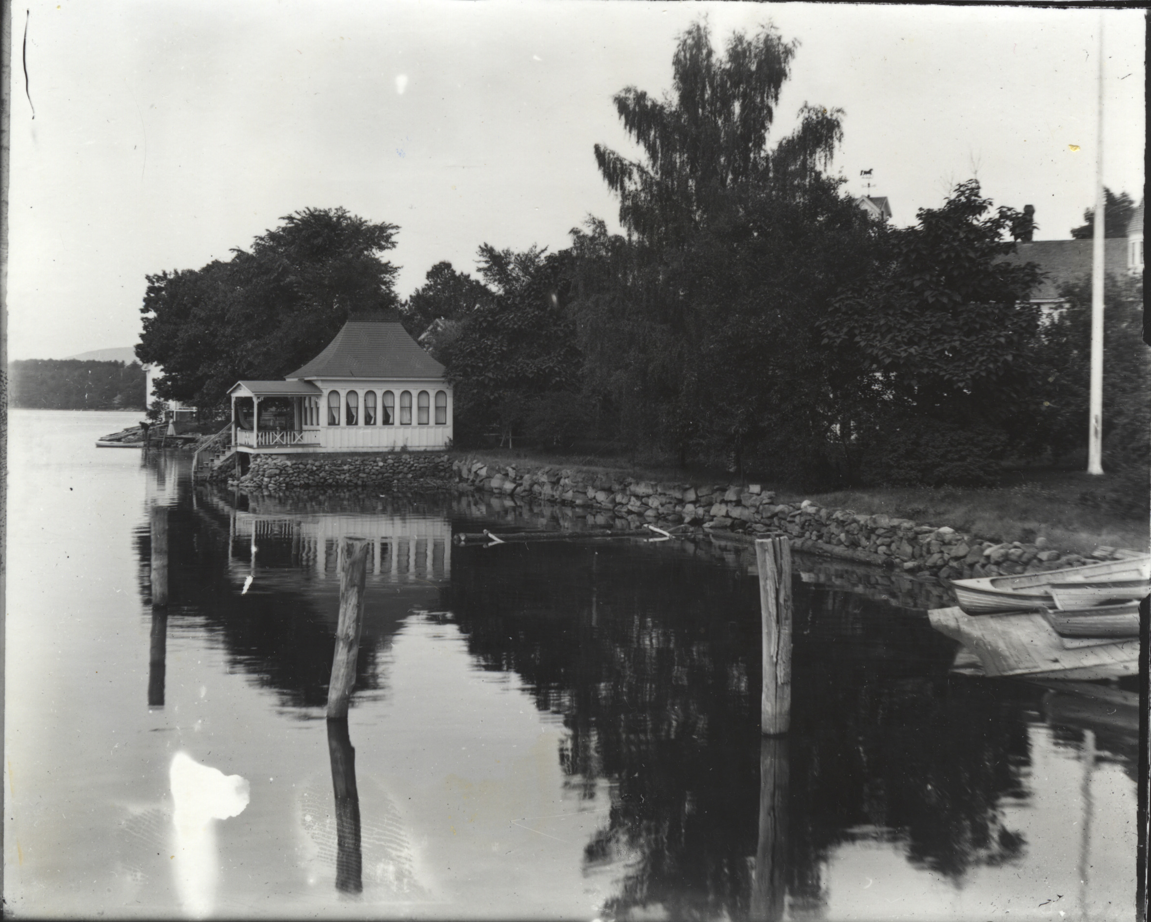 This is the Carroll D. Piper boathouse off North Main St., c. 1905. The rock retaining wall on the right is behind the present Yum Yum Bakery.