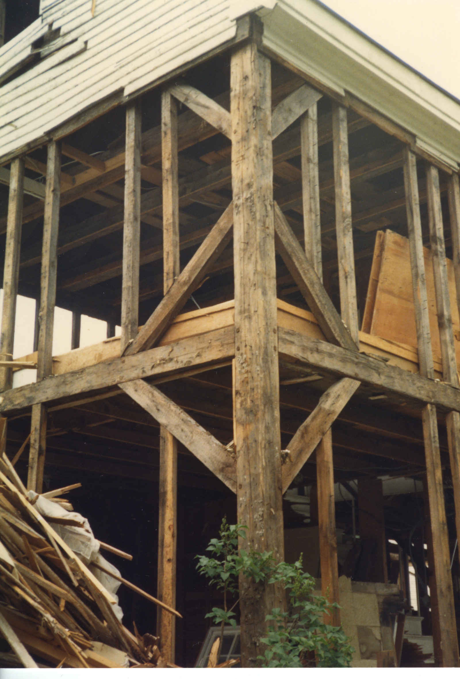 The Samual Nudd house at Wolfeboro Center, built c. 1800, is being torn down in 1988. The north corner shows the original post & beam framework.