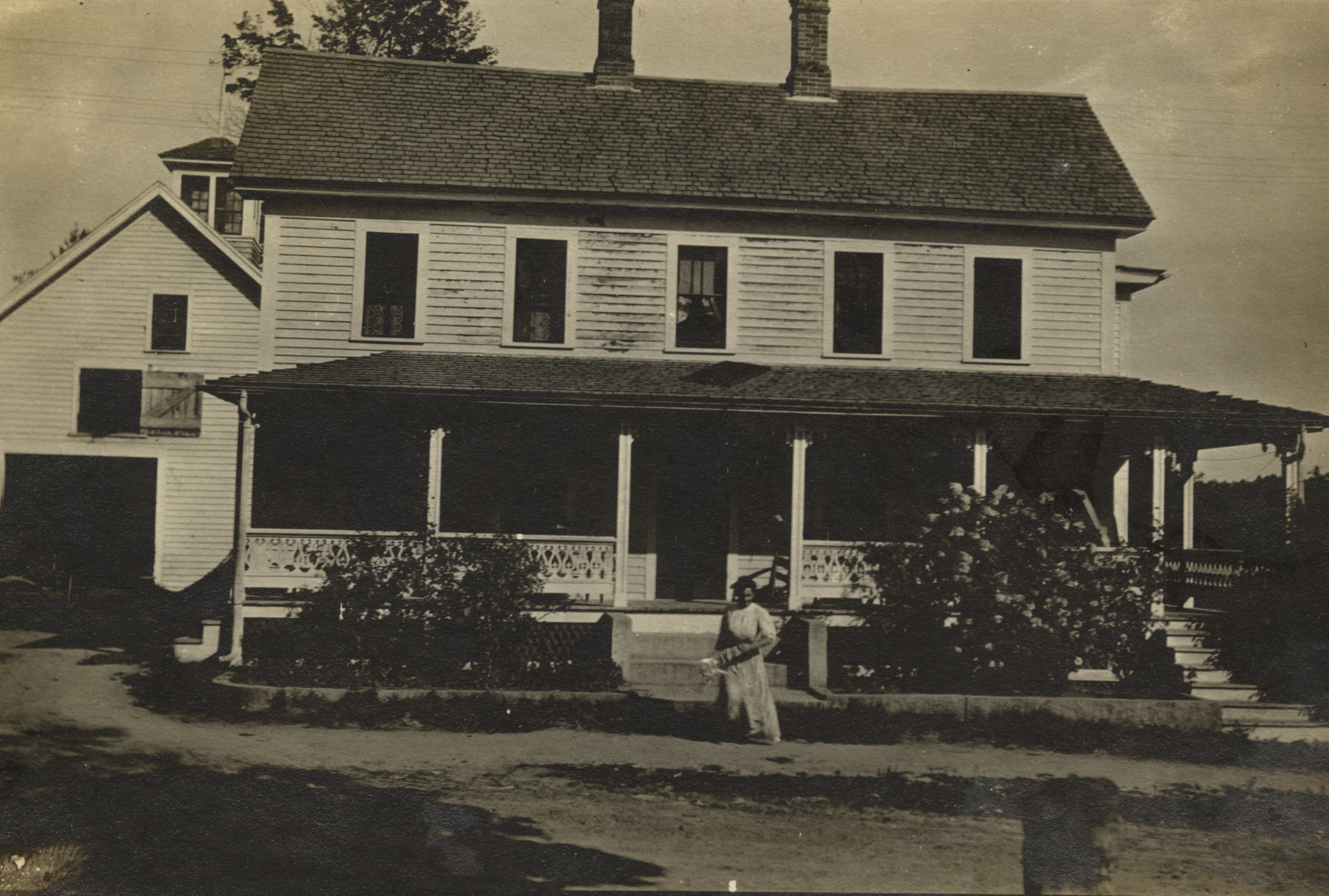 The Lorenzo T. Grant homestead, later owned by his son, Charles R. Grant, was located on South Main St. to the left of the South Wolfeboro Schoolhouse. This view, c. 1900, was on a glass slide and was accidentally printed backwards. Their livery barn in back was operated by several generations of the family. All buildings were torn down by 1964.