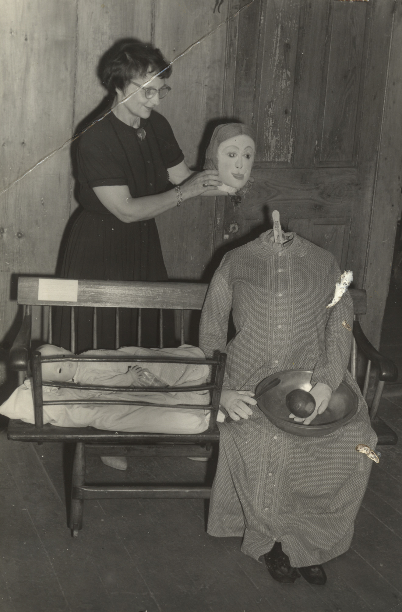 In a bedroom in the Clark House at the Clark Museum Complex on South Main St., 1990, a headless mannequin is being reunited.