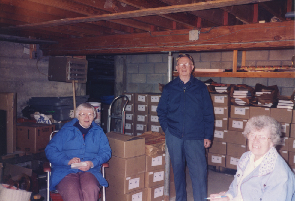 In the Ben Franklin Store basement, on Center St., L-R, Chris Fipphen, Ted Brigden and Joan Kimball are with many cartons of the just-published History of Wolfeboro. Taken 1996.