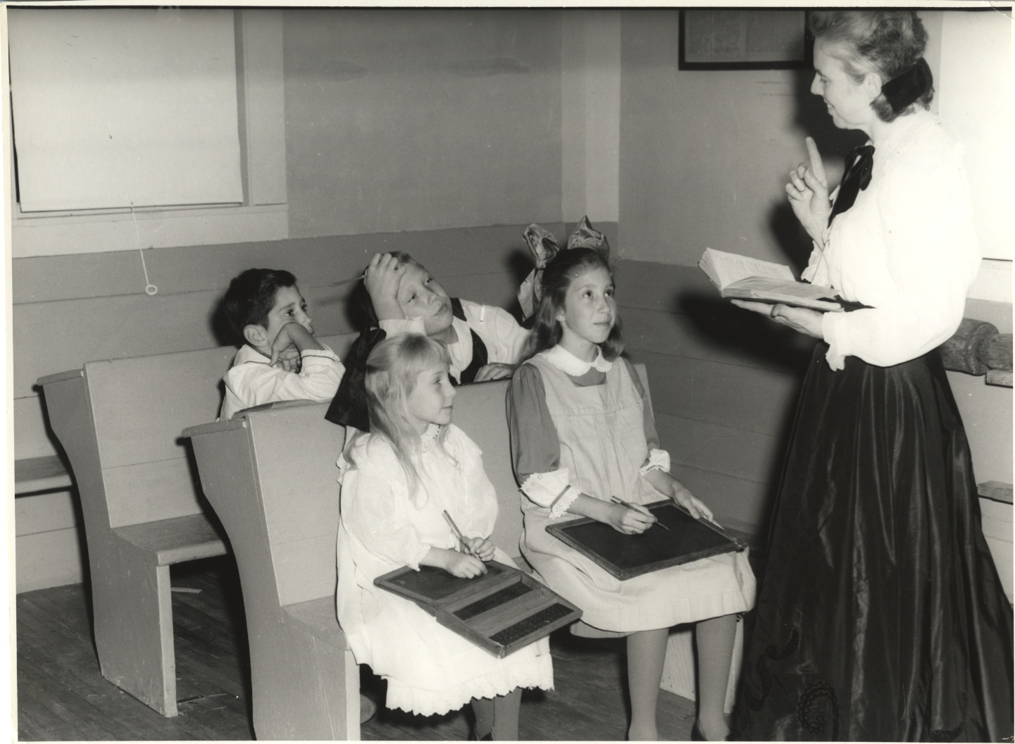 Reenactment of classroom activity in the Pleasant Valley School at the Clark Museum Complex on South Main St. Mrs. Natalie Erickson and the students are in period clothing, using slates and old textbooks. Mrs. Erickson is a teacher at the Carpenter School. The students are: boys, Stephen Brooks (dark hair) and Hollis Brodrick; girls, L-R, Valerie Young and Betsey Brodrick. Taken in 1964 as part of Education Week, which included the Open House of the new Kingswood Regional High School. The Granite State News published a 6-installment essay written by teacher Ethel Rachel Horne on the local schools and a 16-page souvenir issue describing the new school district.