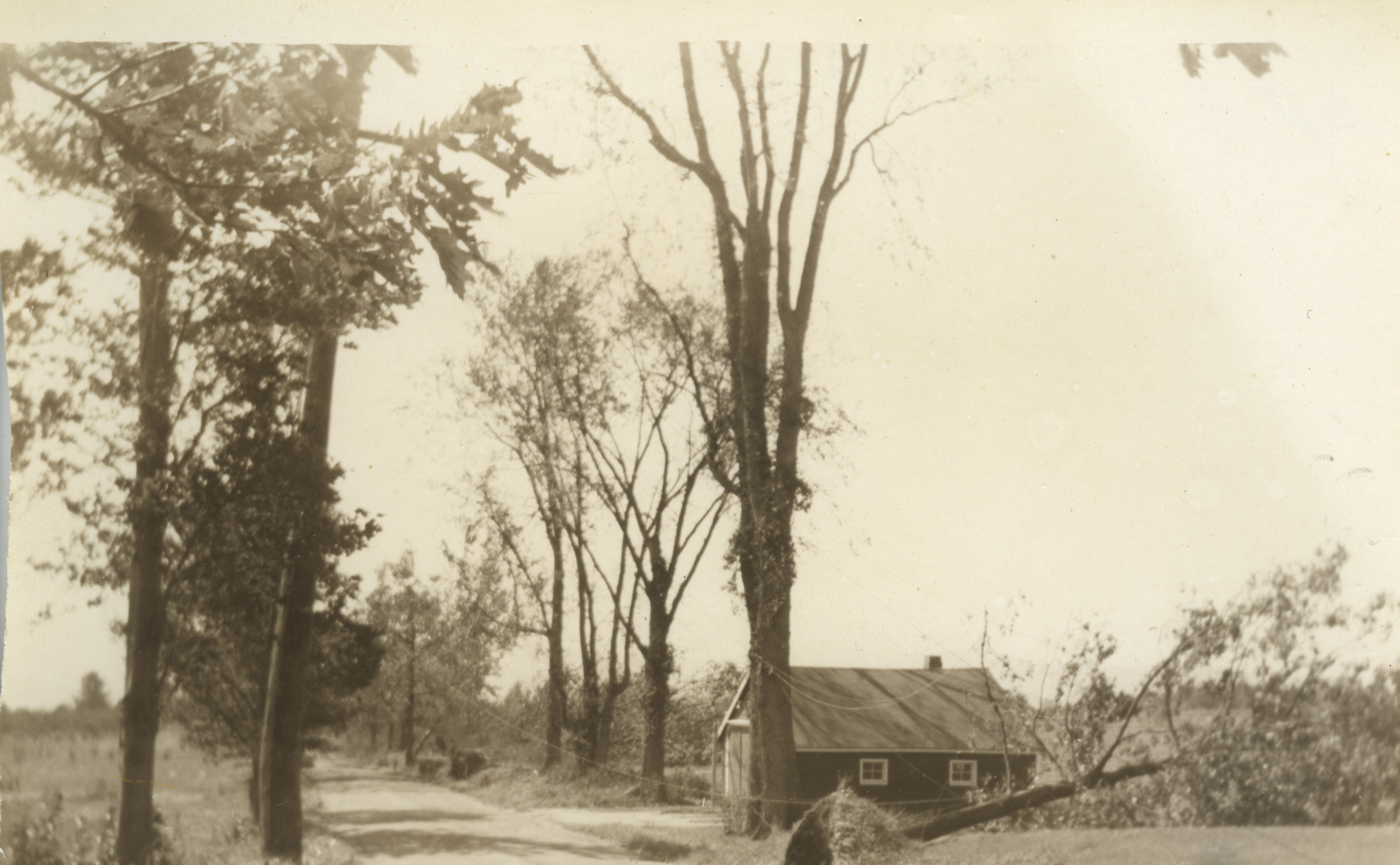 Sept. 21, 1938, hurricane. Tree damage around Fred E. Meader's garage on Forest Rd. View is looking southeast on Forest Rd.