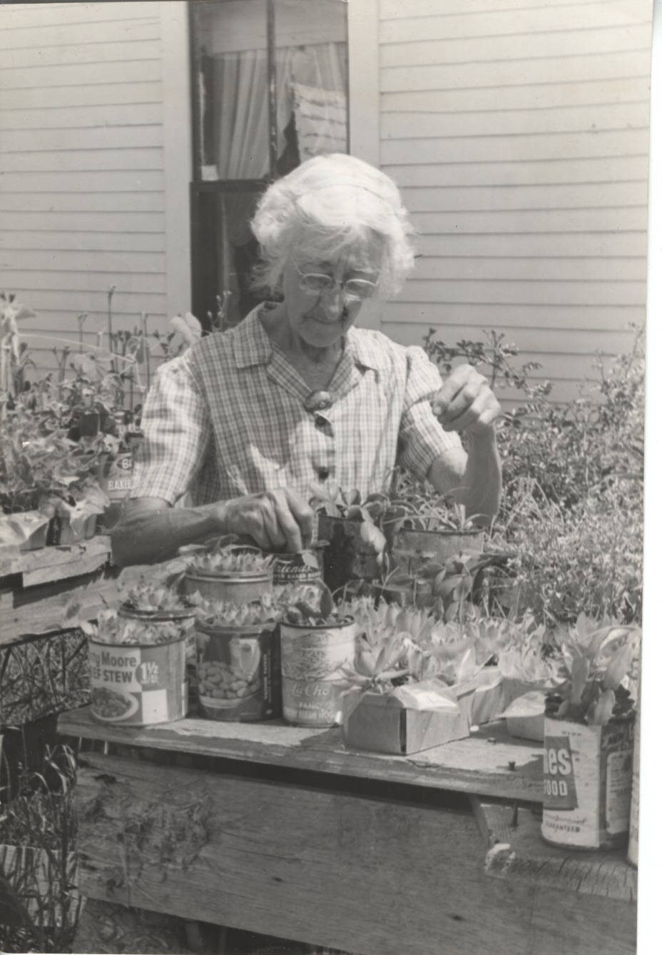 Mrs. Alison Rines prepares seedlings to be sold in the garden booth at the annual Huggins Hospital Street Fair. Many local people contribute to this popular event. C. early 1960's.