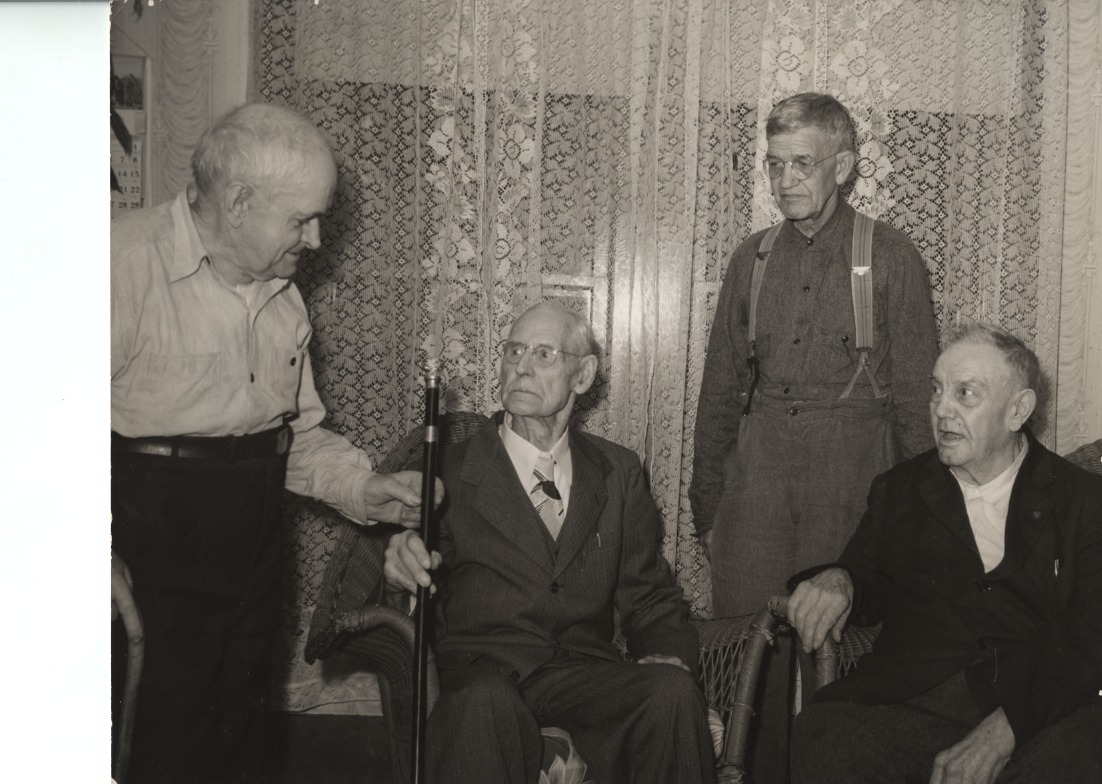 L-R, Samuel Burton, John Vanderpool, Luther Elliot and Isaac Albee. John Vanderpool was presented with the Boston Post Cane by the Wolfeboro Selectmen, as the oldest resident in the town. Oct. 5, 1951. John was 93 (born in 1858), died on July 3, 1957, just short of his 99th birthday.