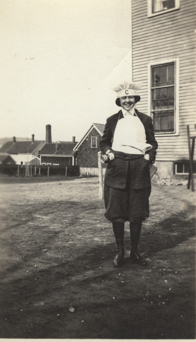 Pickering and Carpenter staff, fashion show. Miss Dott as "Van Campbella Soupe". C. 1920.