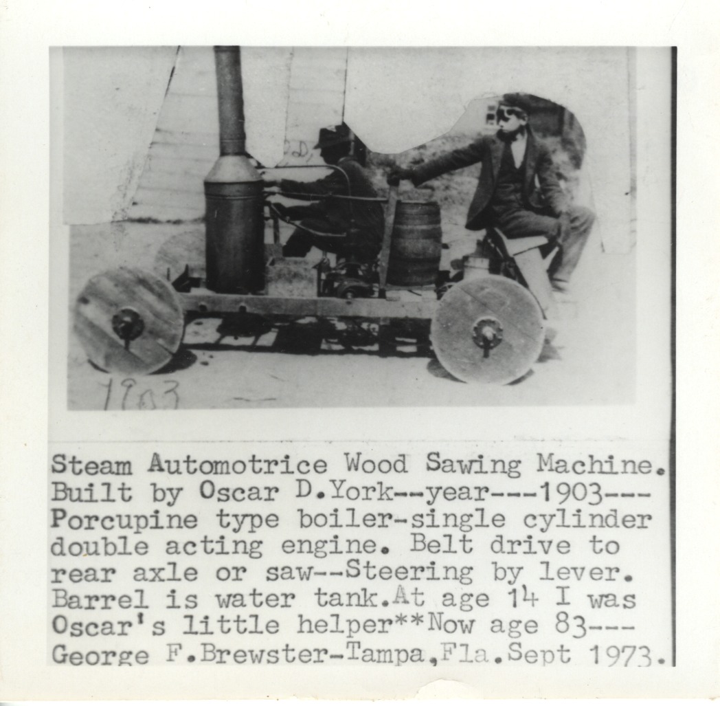 1903 wood sawing machine. Steam driven engine switched between a sawing operation and operating to drive the machine to another location. Inventor Oscar D. York is driving, boy on back is George F. Brewster, age 14.