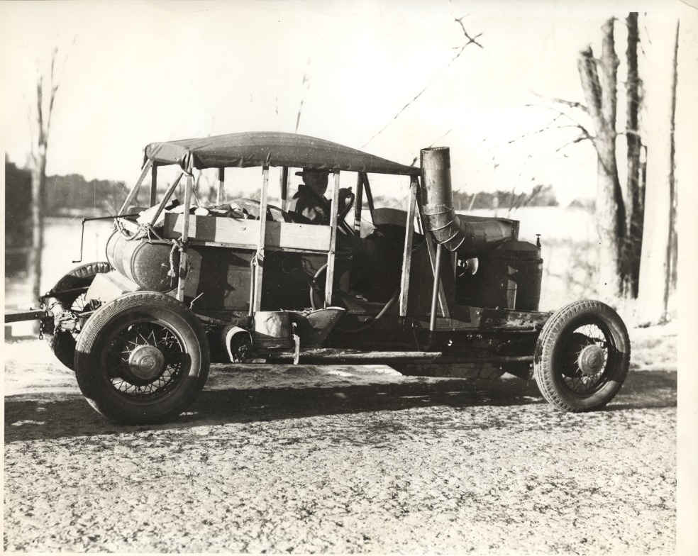 Oscar York rebuilt this Stanley Steamer and found that the best and fastest fuel was pine cones. John Goodwin recalls one day in a thunderstorm, Oscar drove into the Goodwin Barn (N. Main St.) with sparks flying from the stack. John's father had a fit (the barn was filled with new hay) and pushed Oscar right back out into the storm.