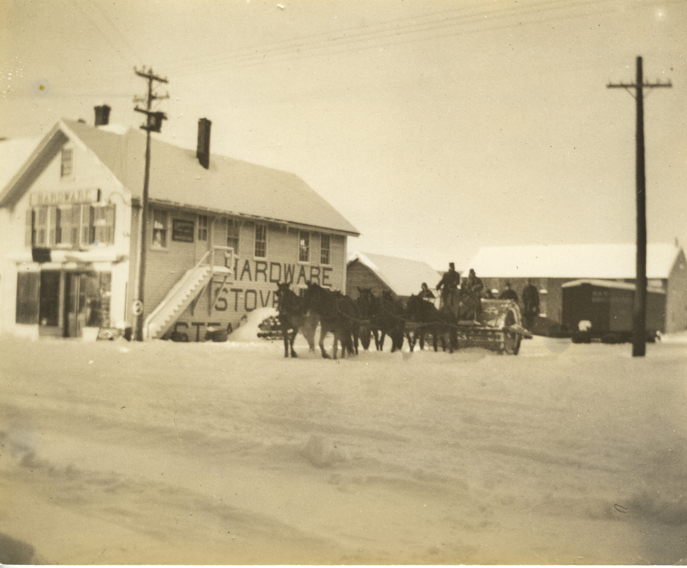 Snow roller on Railroad Avenue, c. 1900. Building on the left was the Blake Folsom Building; building on right, built 1856, is now Bradley's Hardware.