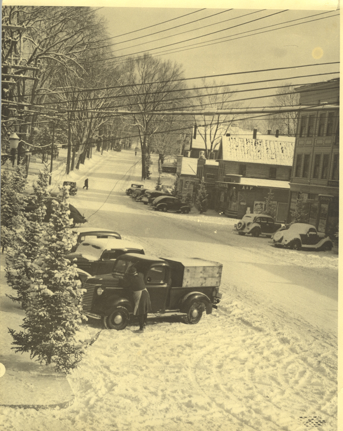 Winter on South Main St., looking southeast. Peavey Block on right, now Avery Block. C. 1940.