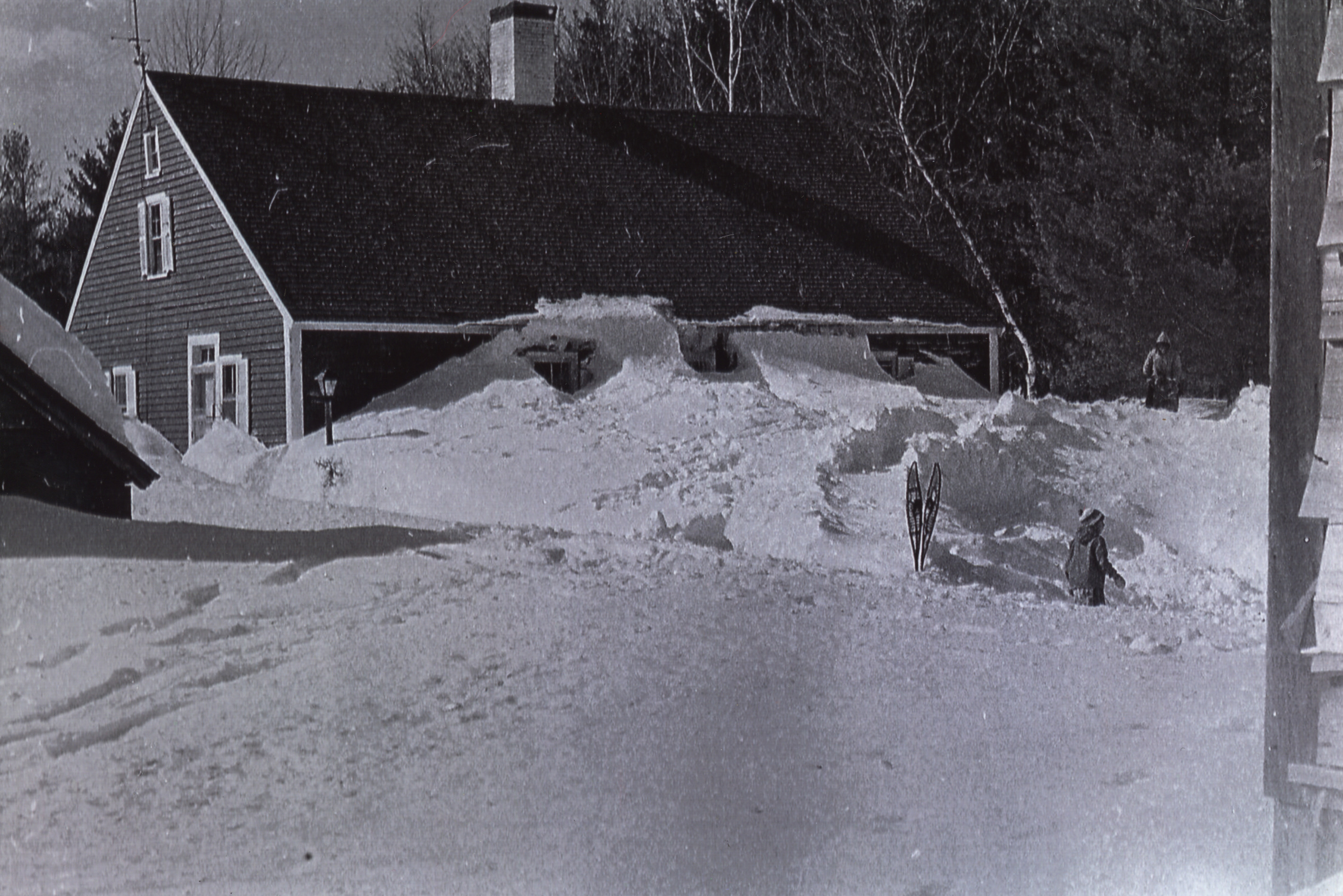 Heavy snow and a roof avalanche blocks the windows, c. 1965.