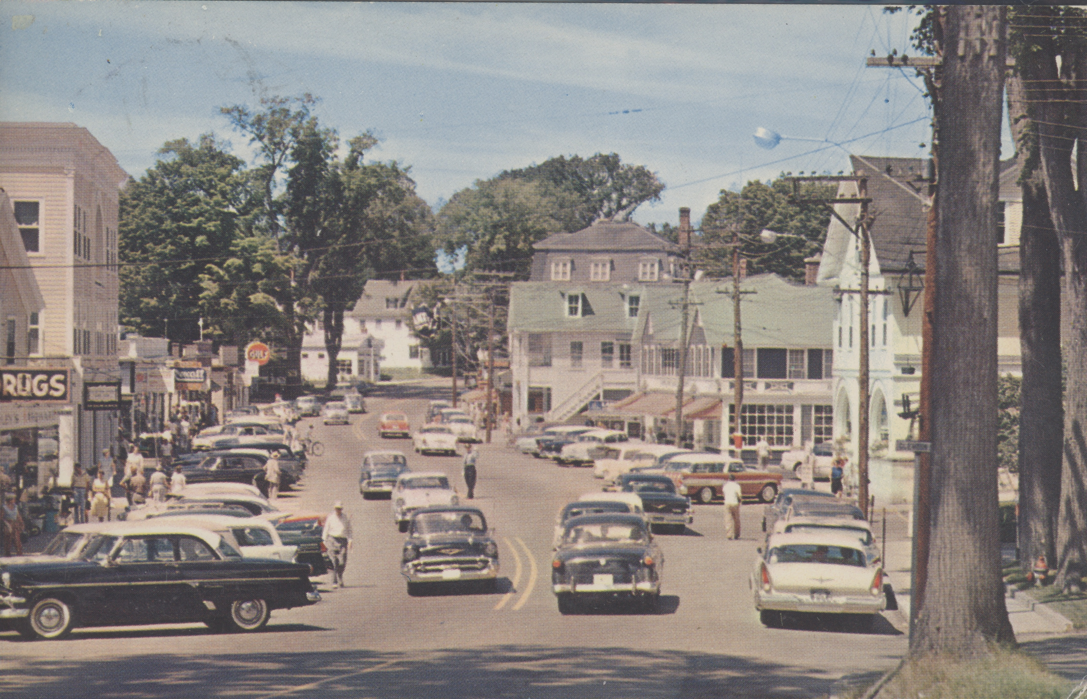View from South Main Street in front of the Post Office to center of downtown. Buildings on the right are Bank Building, Black's Paper Store, Wool Corner and the tall Durgin Building. The left side, starting with the tall Avery Building, is similar today with one notable exception; the Gulf Gas Station, located at the site of the present Yum Yum Shop, was there from 1957 to 1977. The 4 cent stamp on the card, combined with the lack of a zip code, dates this to 1963.