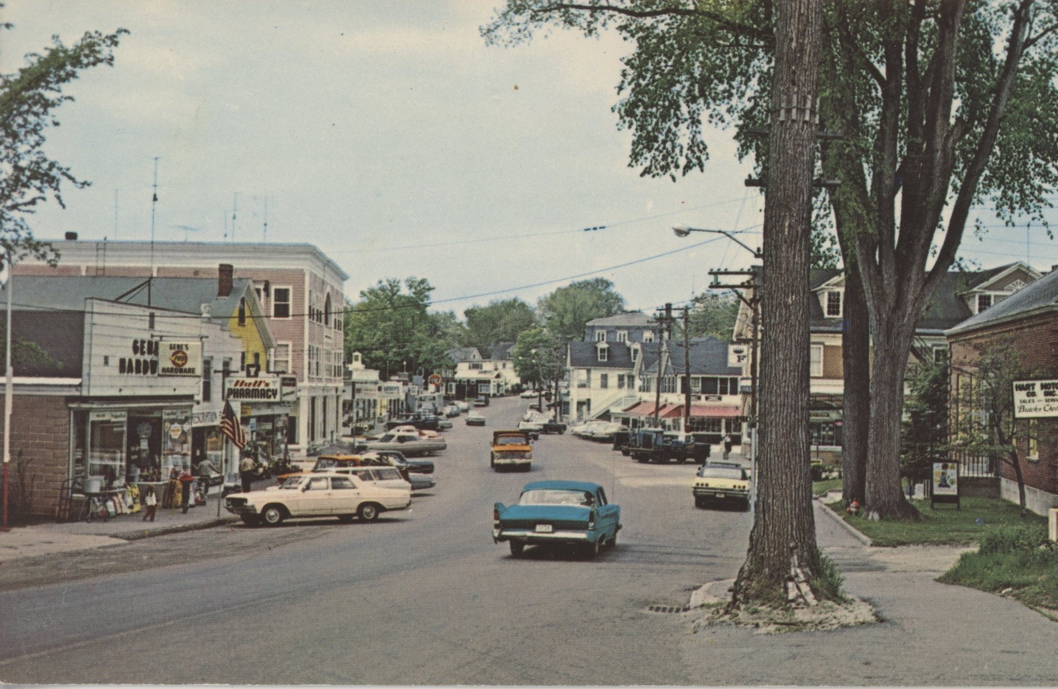 Familiar view of downtown from South Main Street. Gene's Hardware on the left was there from 1958 into the 1970's. Note the large surviving elm trees. C. 1970.