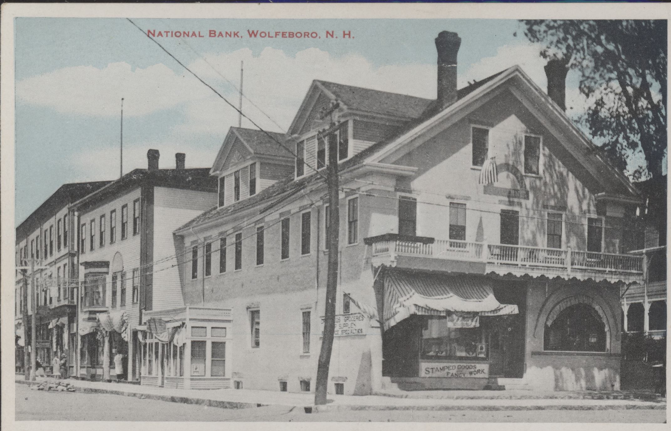 The Bank Building on South Main Street, between Railroad Avenue on the left and Central Avenue on the right, was built in 1856 and has seen many changes over time. The Lake National Bank occupied this building from 1865 until it relocated in 1890. The Wolfeboro National Bank was located here from its founding in 1906 until it relocated in 1963. The store on the left is Charles H Hersey's Grocery and General Store, which was there from 1865 to 1910. The balcony was added in 1907, dating this card to 1907-1910. The buildings down Railroad Avenue were known as Central Block and Goodwin Block (and a few other names) in history books, but those names are now generally forgotten. The small building on the left side of the Bank Building is now the popular Bailey's Bubble.