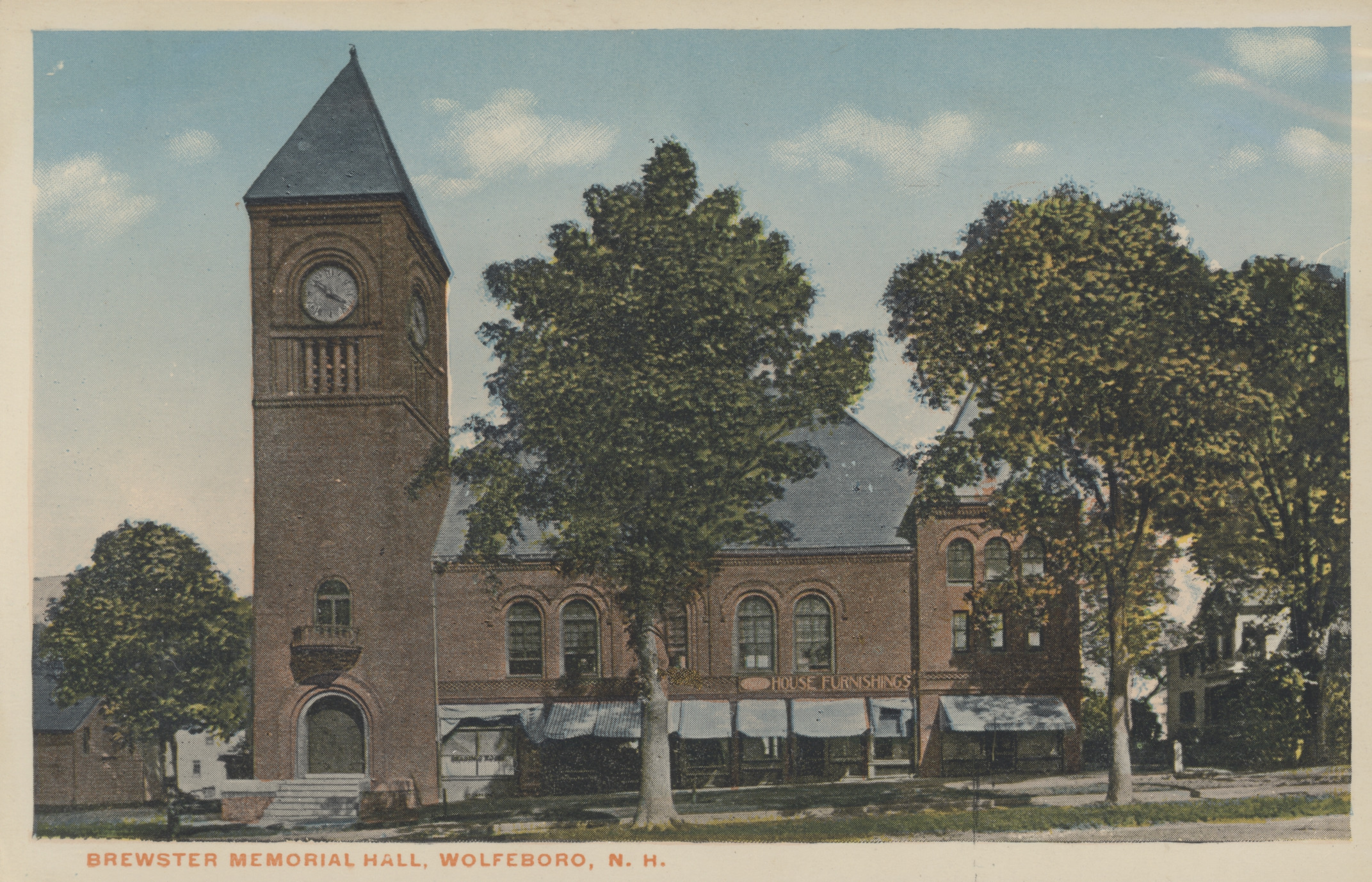 Brewster Memorial Hall, also known as Town Hall, was built in 1890 by the Brewster Trust. Town meetings were held there and the Town Library was in the rear. In the late 1800's and early 1900's, four businesses were in the front. For many years, a theater was on the second floor. The building was listed on the National Register of Historic Places in 1983. Card is c. 1915.