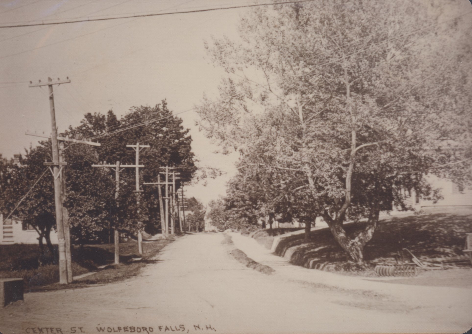 Junction of Center Street and Elm Street, looking north. The structure partly seen in the road on the left is a horse watering trough, which is now on the grounds of the Clark Museum Complex. Early 1900's.