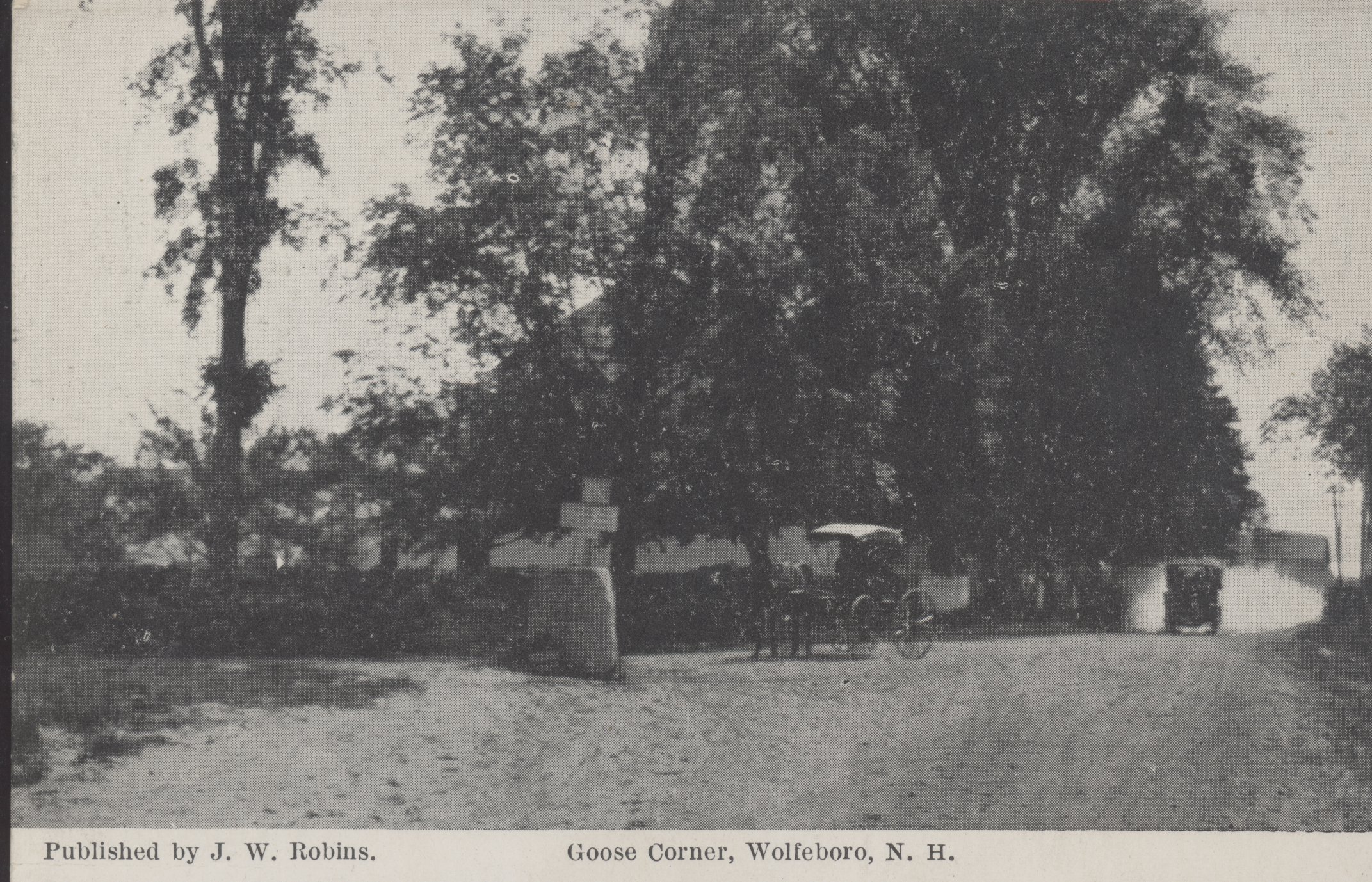 Goose Corner was the area around the junction of North Main Street and Waumbeck Road. In the early days, with poor and inconsistent roads, several self-sufficient communities were established. Most remnants of these communities have disappeared over time. Notice the interesting contrast of the horse-drawn buggy and the early car raising a cloud of dust. Early 1900's.