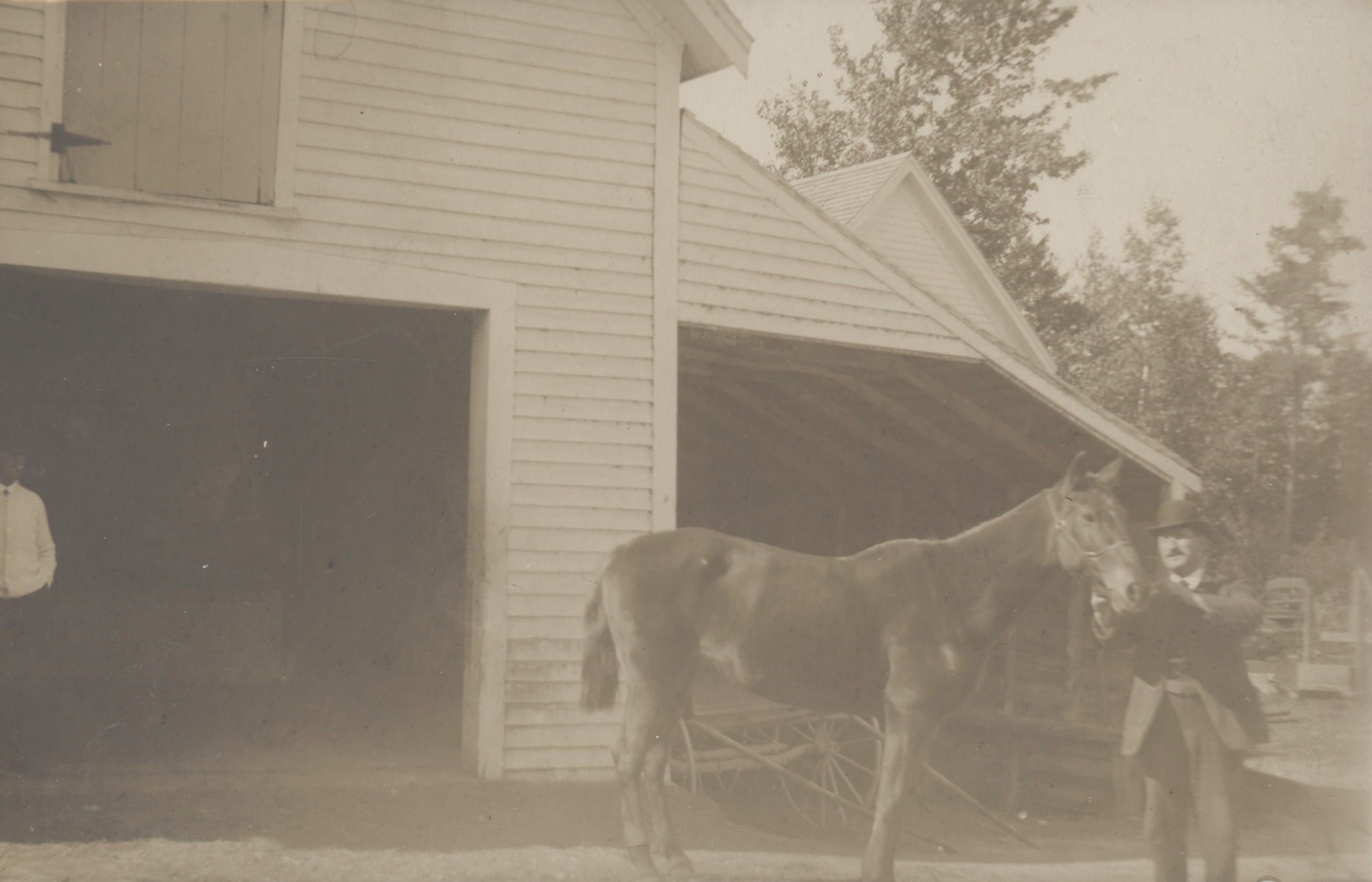 Charles R. Grant was a teamster. Teamsters were the truckers of yesterday, hauling cargo using horses and wagons. He is in front of his livery stable on the north side of South Main Street, where horses were also available for hire. Card is before 1907.