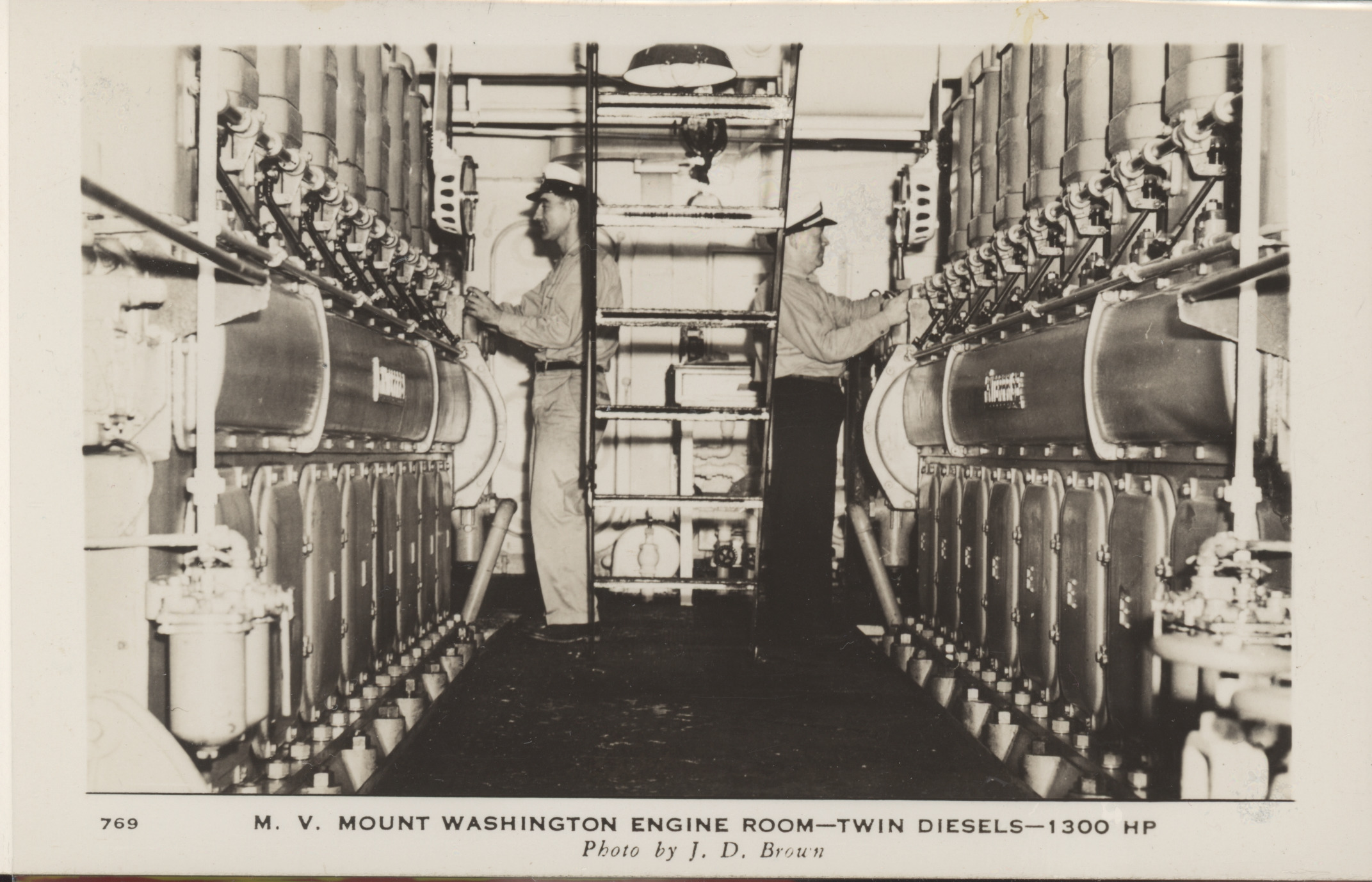 Mount Washington II Engine Room. These engines were installed in 1946. The original engines had been requisitioned for used during WWII and were lost at sea.