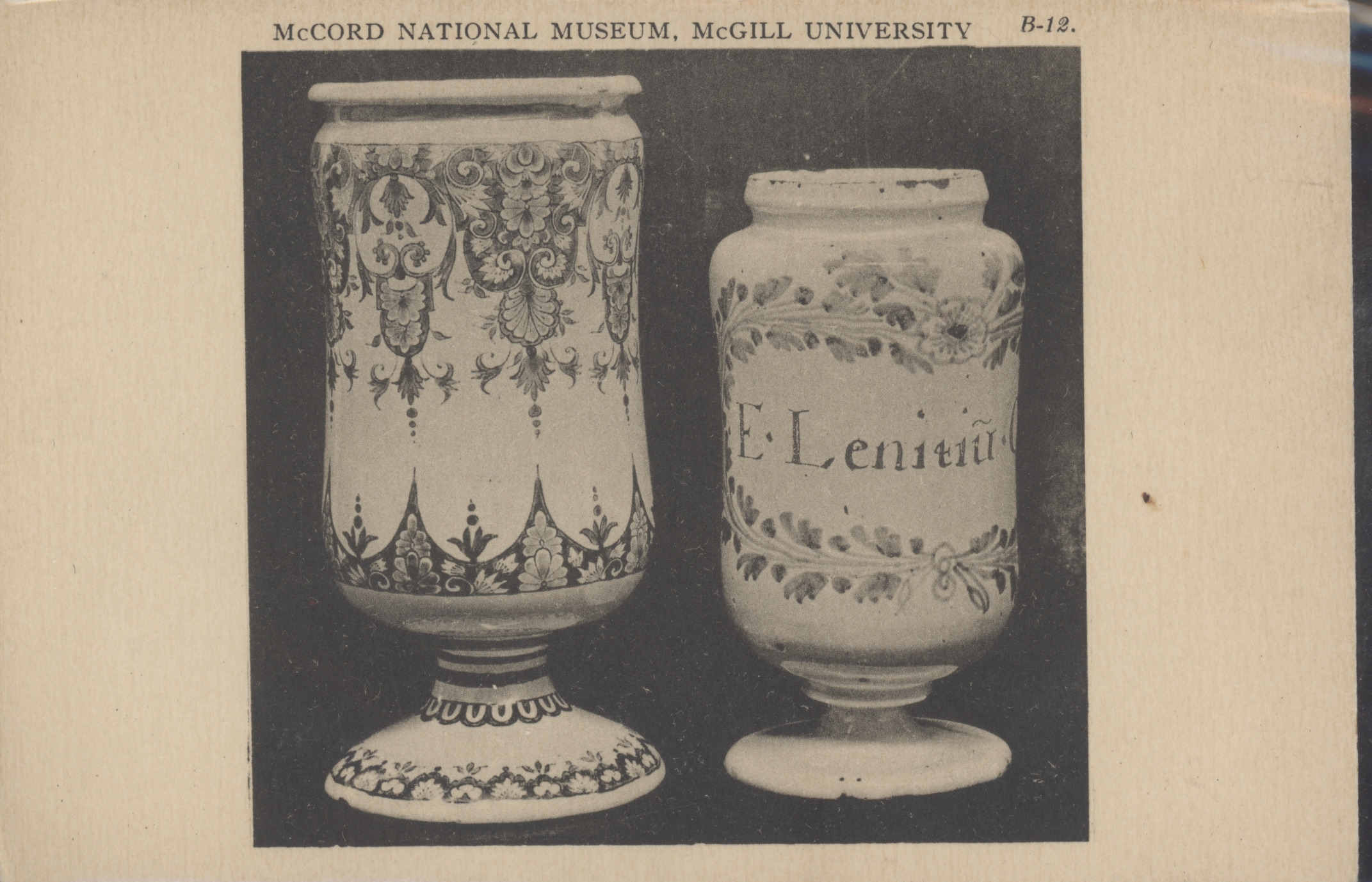 Two French tin-enamel drug jars from the 1600's that would have still been in use in the time of James Wolfe presence in the 1750's. Postcard displays an item in the collection of the McCord Museum, McGill University, Ottawa, Canada.