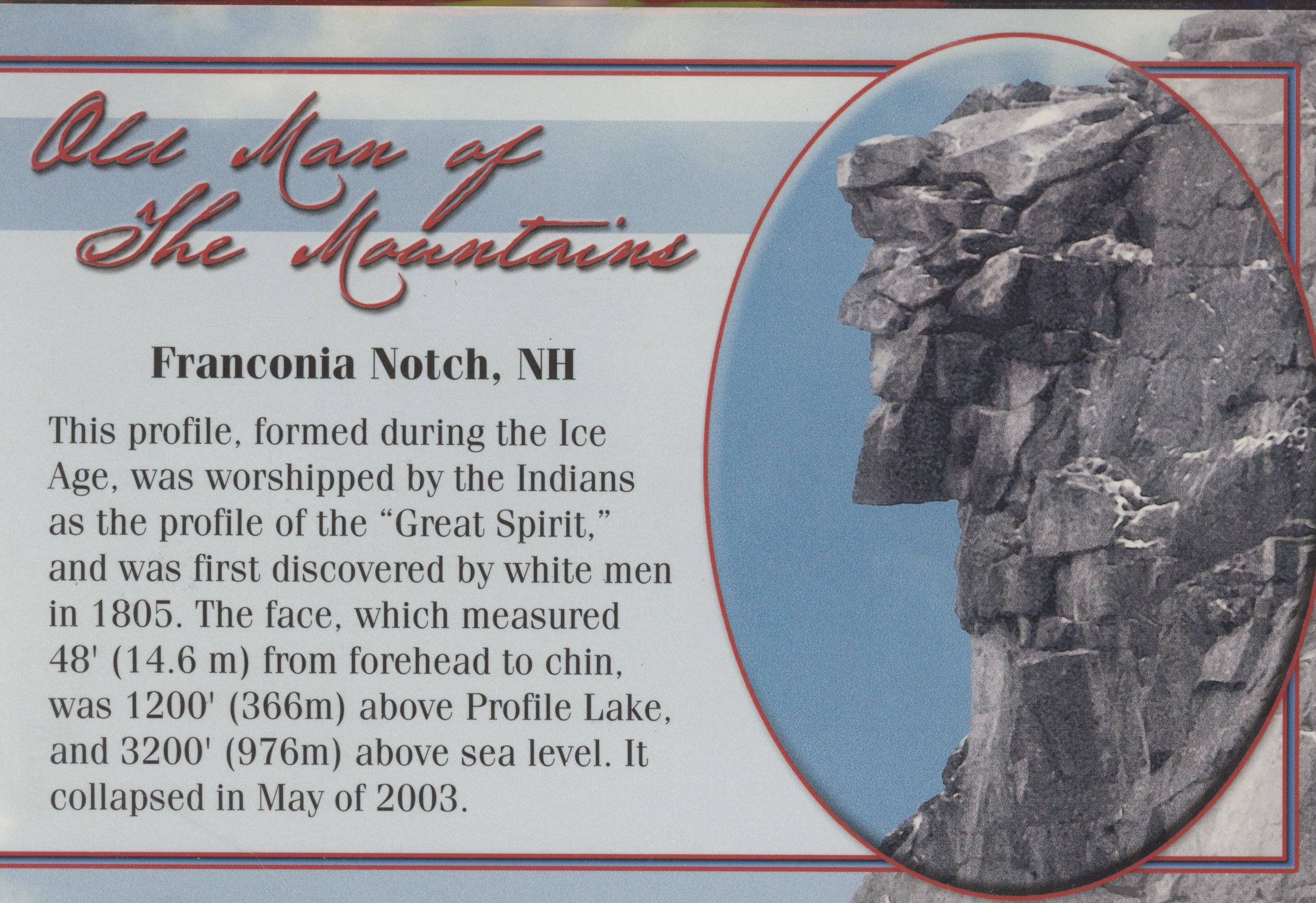 The famous Old Man of the Mountains will live forever in our memories. The image remains on the state quarter, issued in 2000, and on state auto license plates. Card is after the 2003 collapse.