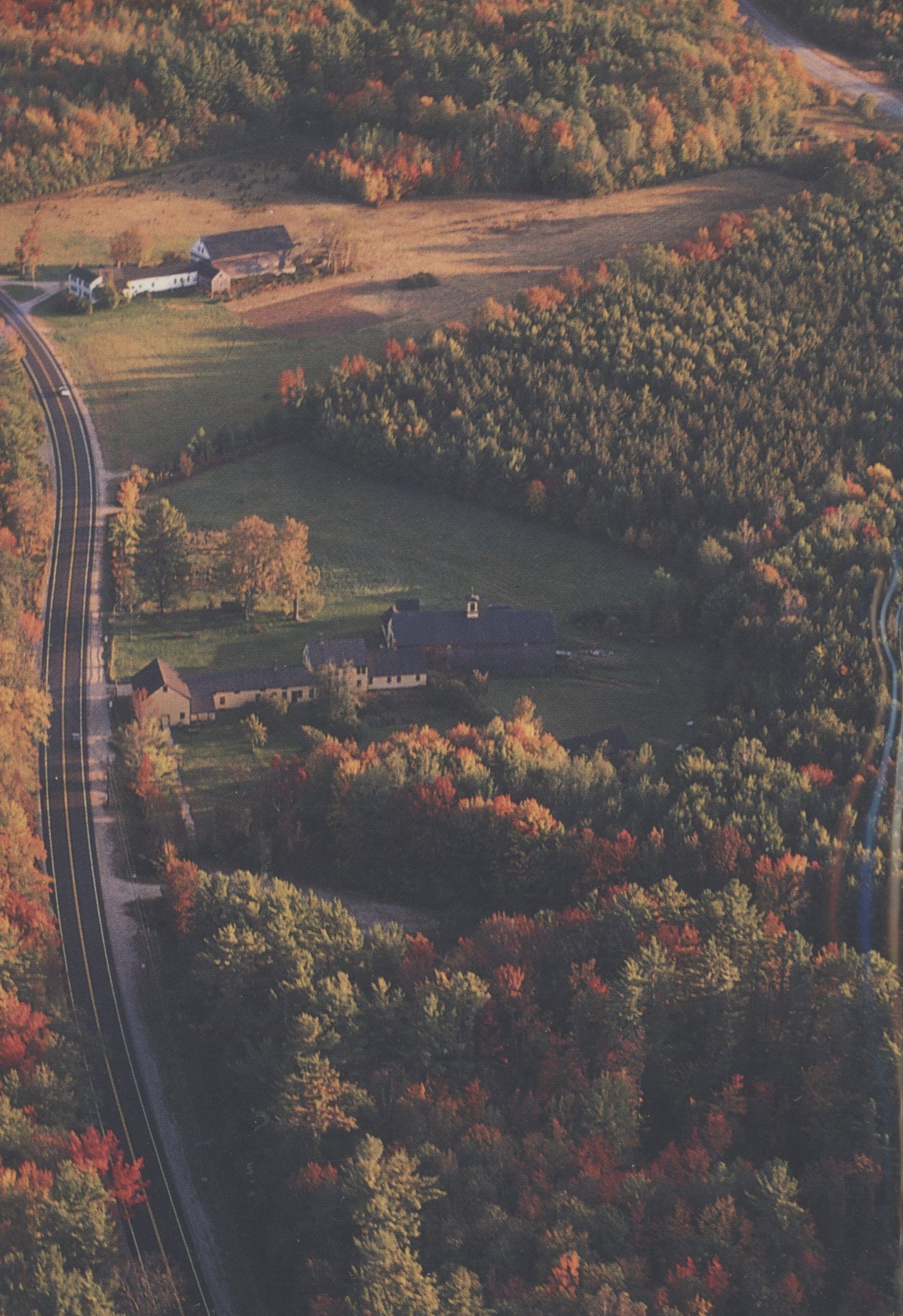 Aerial view of NH Farm Museum and other historic farms on Rt. 125 in Milton, NH. The Museum acquired buildings in this area in 1969.