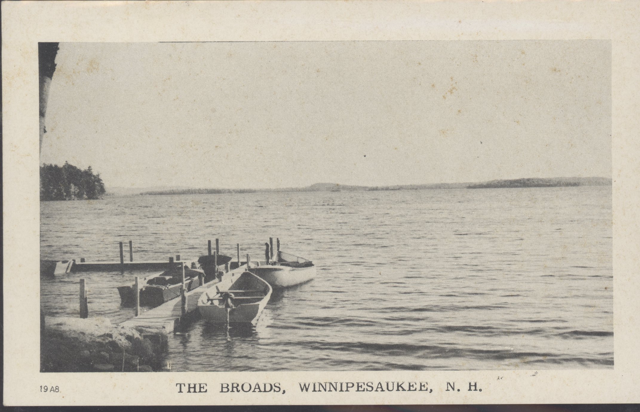 The Broads is the widest open area, roughly in the middle of Lake Winnipesaukee, north of Wolfeboro Bay. It is also the roughest area in heavy winds. Card is early 1900's.