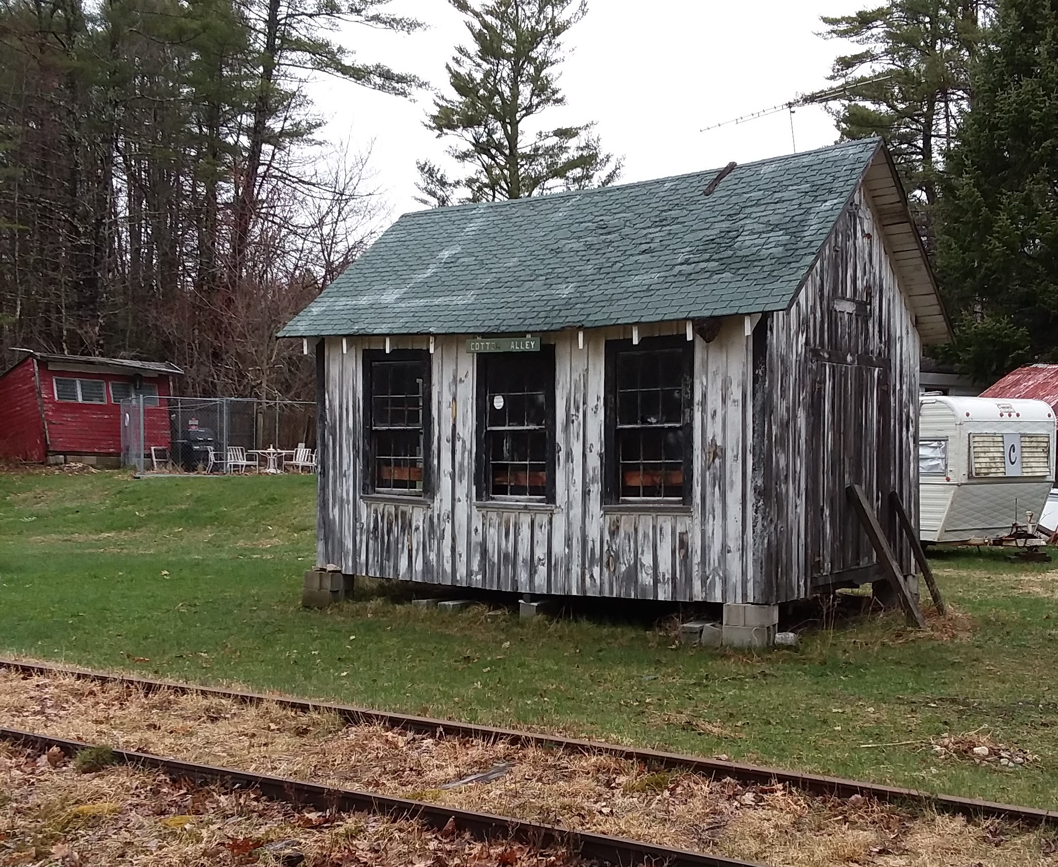 The Cotton Valley Railroad Station was located at the end of Cotton Valley Road. The original railroad station building was gone many years ago; this building was originally a shed on the Point Breeze property on Lake Wentworth and was moved here to use as a storage building for the Wolfeboro tourist railroad about 1970.